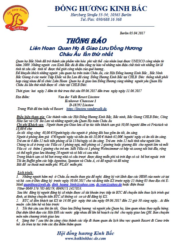 HĐH Kinh Bắc Mời tham dự Liên hoan Quan họ và giao lưu đồng hương 09/04/2017 | | 5.025 Recommended for You Kêu gọi Bắt cóc? Thực tập sinh Việt Nam bị bóc lột như thế nào Tỷ phú giàu nhất Việt Nam thua kiện một nhà báo tự do – Trận so găng giữa tiền và tự do ở Berlin Tỷ phú kiện nhà báo PHẠM NHẬT VƯỢNG RA TÒA TẠI ĐỨC! CHẤN ĐỘNG: PHẠM NHẬT VƯỢNG BỊ TÒA ÁN ĐỨC TRIỆU TẬP! TÌNH HÌNH XUẤT KHẨU NGƯỜI VIỆT NAM SANG ĐỨC HỌC NGHỀ: NHIỀU NGƯỜI BỖNG NHIÊN BIẾN MẤT! Bộ Quốc Phòng – “Lính Canh Tự Do Ngôn Luận”, Quên Cả Tổ Quốc Bỉ và Việt Nam cách nhau bao xa, trong những khía cạnh khác nhau? AN NINH CSVN THEO TÔI ĐẾN TẬN MỸ Cháy lớn tại Chợ Sapa của người Việt ở Séc Về Nguyễn Thị Thanh Nhàn Trung tâm thương mại Marywinska tại Ba Lan bốc cháy, hàng nghìn người Việt bị mất tài sản! Truy tố 8 người Việt Nam tham gia bắt cóc Trịnh Xuân Thanh ở Slovakia Ba người Việt bị thương chí mạng trong vụ đánh nhau tại chợ Đồng Xuân Berlin Cánh tay nối dài của đại sứ quán Việt Nam tại Đức?