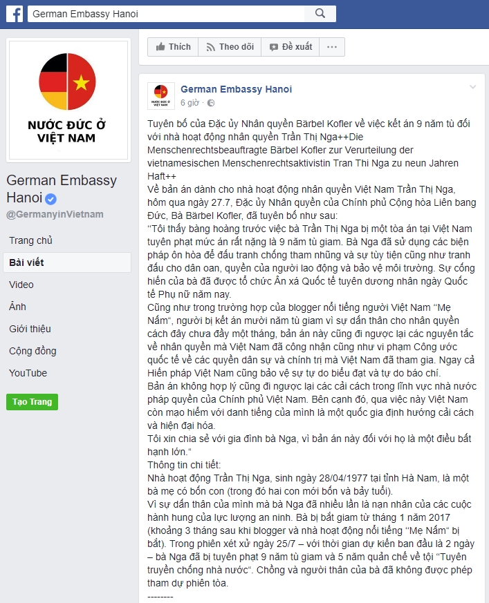 Bộ Ngoại giao Đức ra thông cáo báo chí về việc chị Trần Thị Nga bị tuyên án 9 năm tù tại Việt Nam: http://www.auswaertiges-amt.de/DE/Infoservice/Presse/Meldungen/2017/170727_Vietnam.html